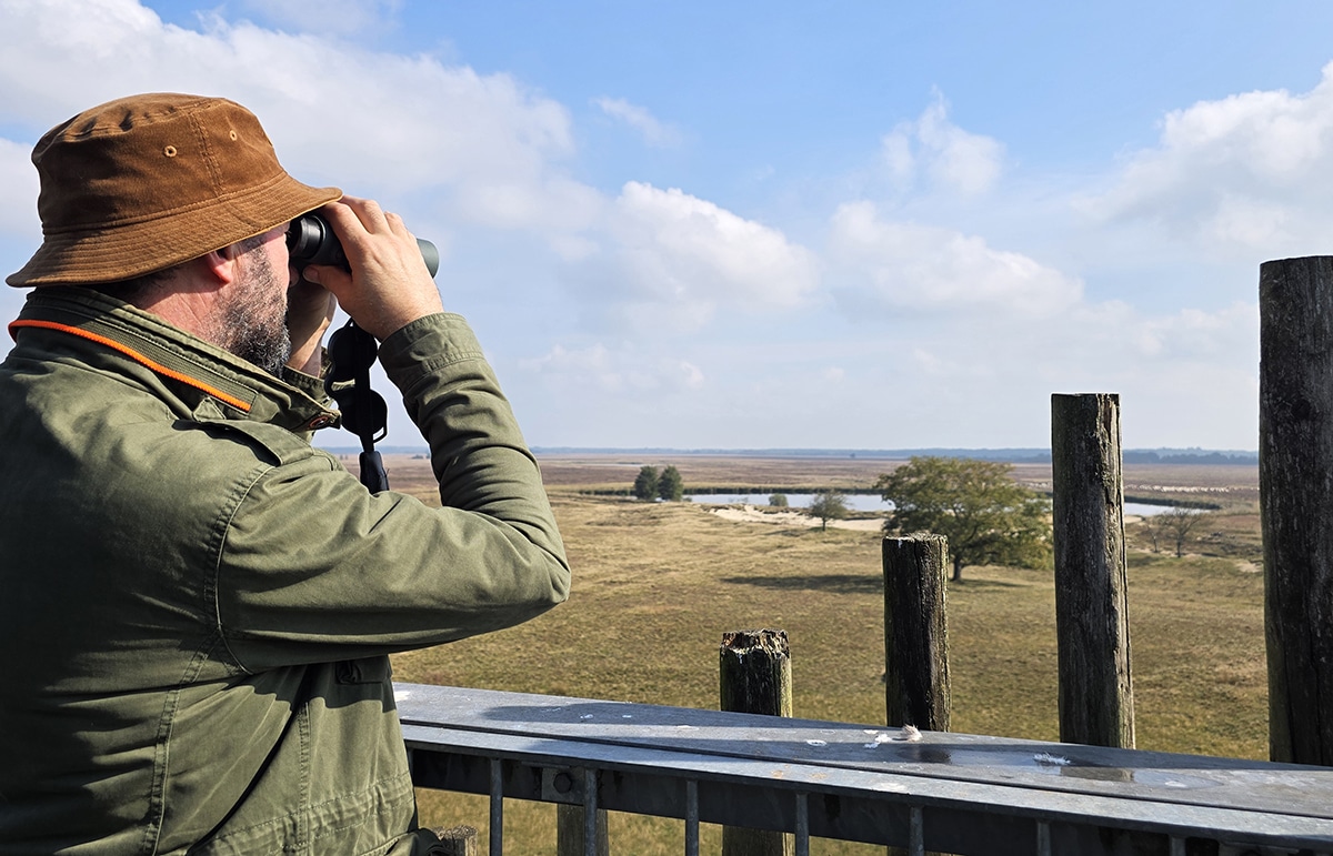 Niet veel later stonden we boven op de uitkijktoren bij de schaapskooi. Vanaf hier ontvouwt het Dwingelderveld zich als een schilderij: glooiende heidevelden, glinsterende pingoruïnes en een horizon vol wolkenpartijen en stilte. De specialisten van Verrekijkershop.nl lieten ons verschillende soorten verrekijkers proberen: van compacte modellen voor wandelaars tot krachtigere kijkers met meer lichtopbrengst voor schemermomenten en de beste kijkers voor vogels spotten.