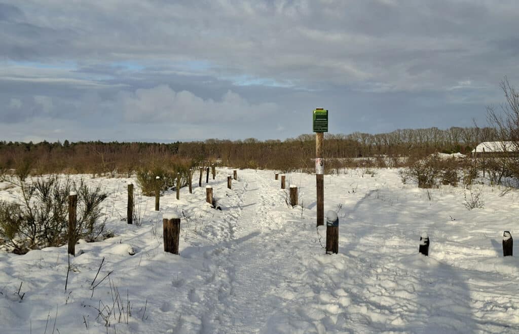 We vervolgen onze weg door het winterse landschap. De blauwe paaltjes geven goed de richting aan. Nadat we door de bossen hebben gewandeld, komen we niet veel later uit op een open heidegebied. Wat een weidse uitzichten. We staan even stil om goed om ons heen te kijken.