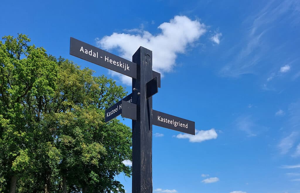 Niet veel later buigen we even linksaf om de uitkijktoren De Heeskijk te beklimmen. Deze houten uitkijktoren staat op een heuvel en beklim je via de openslaande poorten en houten loopbrug, alsof je een kasteel betreedt. Eigenlijk is dat ook zo, want de toren is min of meer geïnspireerd op een oude motteburcht, een middeleeuws, torenvormige versterking, die ooit op de plek waar Kasteel Heeswijk zich nu bevindt, heeft gestaan.