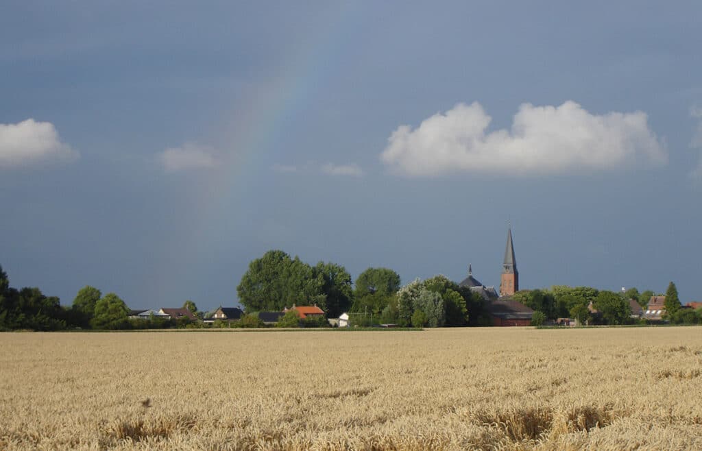 Eenmaal bij wandelknooppunt 36 sla je linksaf het binnenland van Zeeuws-Vlaanderen in, in de richting van nummer 38. Je wandelt door Zeedorp, een buurtschap dat zo’n dertig schattige huizen telt. Al snel ben je uit Zeedorp en je vervolgt de wandeling over een smalle weg met uitzicht over het Zeeuwse vlakke land.