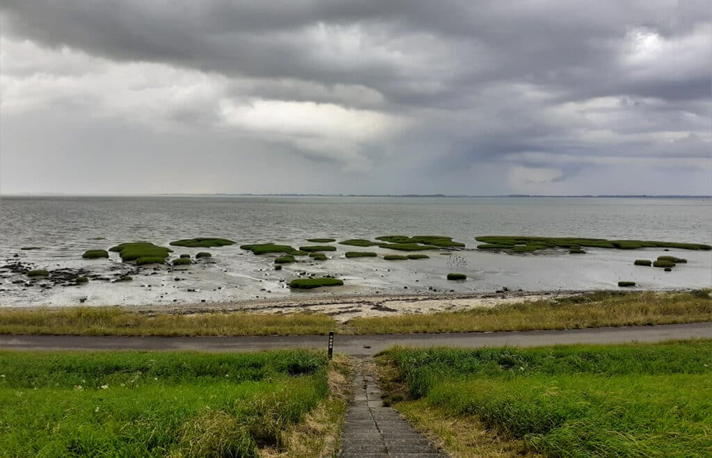 Je vervolgt het wandelpad aan de oevers van de Westerschelde in de richting van wandelknooppunt 39. Ook vanaf de grond zijn de uitzichten weids en heb je een mooi uitzicht over de voorbijvarende schepen. De route voert langs camping De Zeemeeuw af, in de richting van knooppunt 36. Ook hier ontdek je alleen maar weidse uitzichten, water, schepen en flink veel wind.