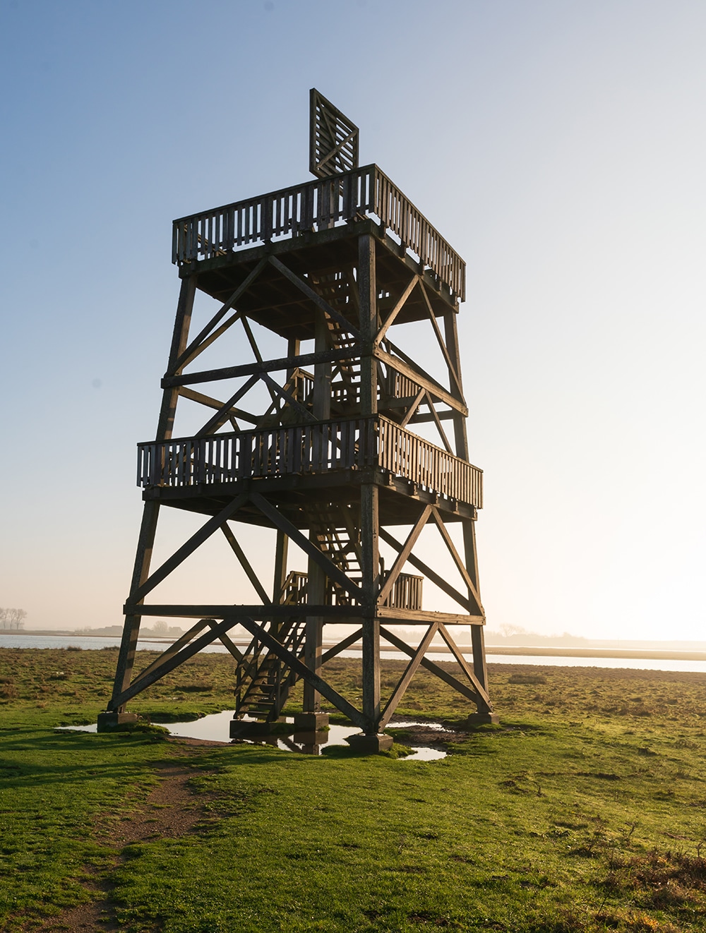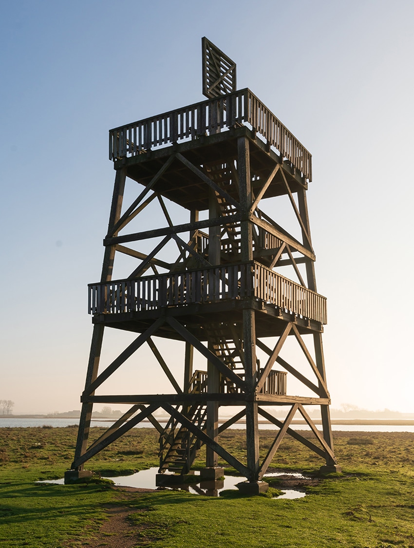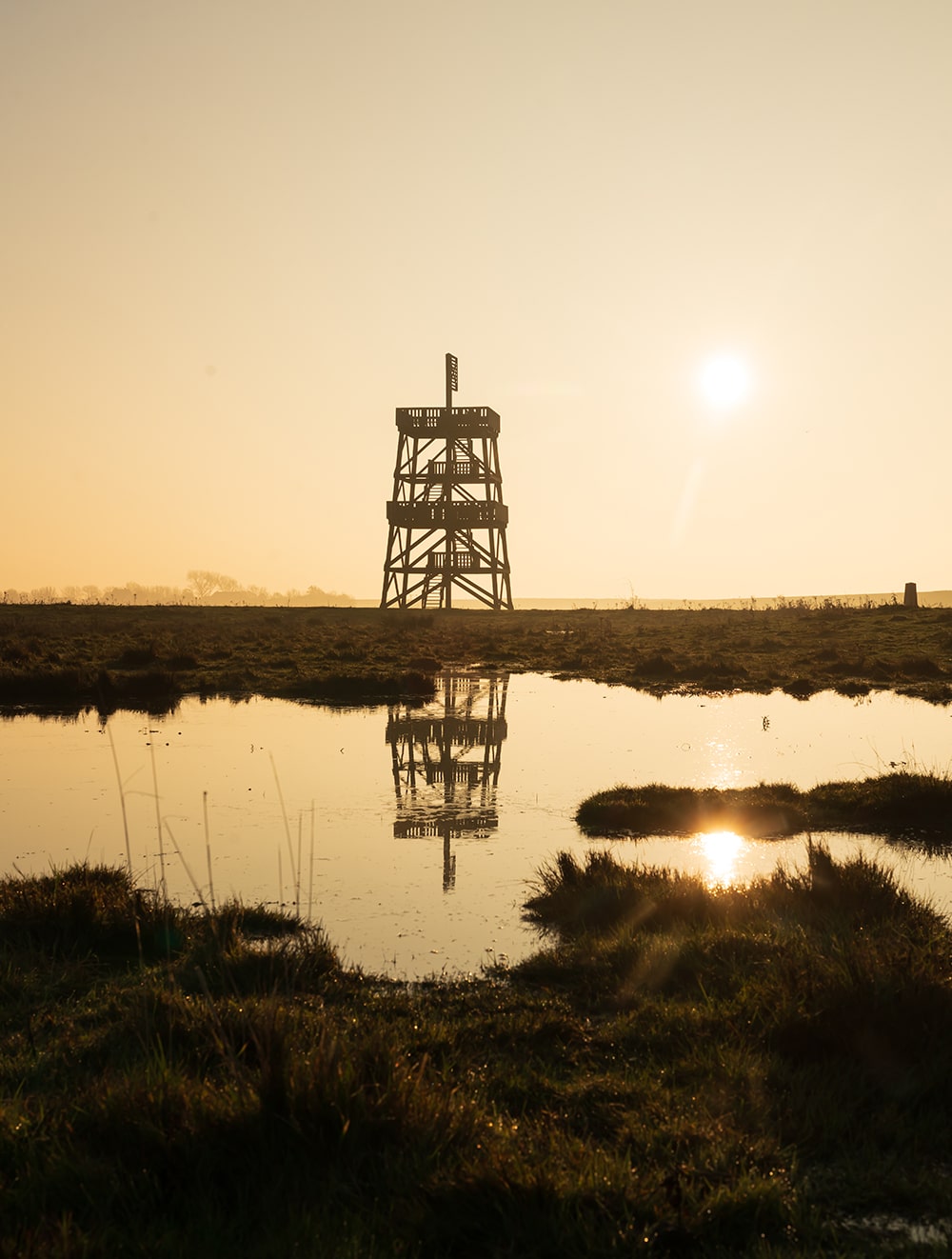 Vanaf de top van deze toren kijk je weids weg over het omliggende natuurgebied: de grillige kreken en drassige moerassen van het grotendeels niet-toegankelijke Plan Tureluur. Spot talrijke vogels. Wie weet zie je zelfs een kudde runderen grazen.