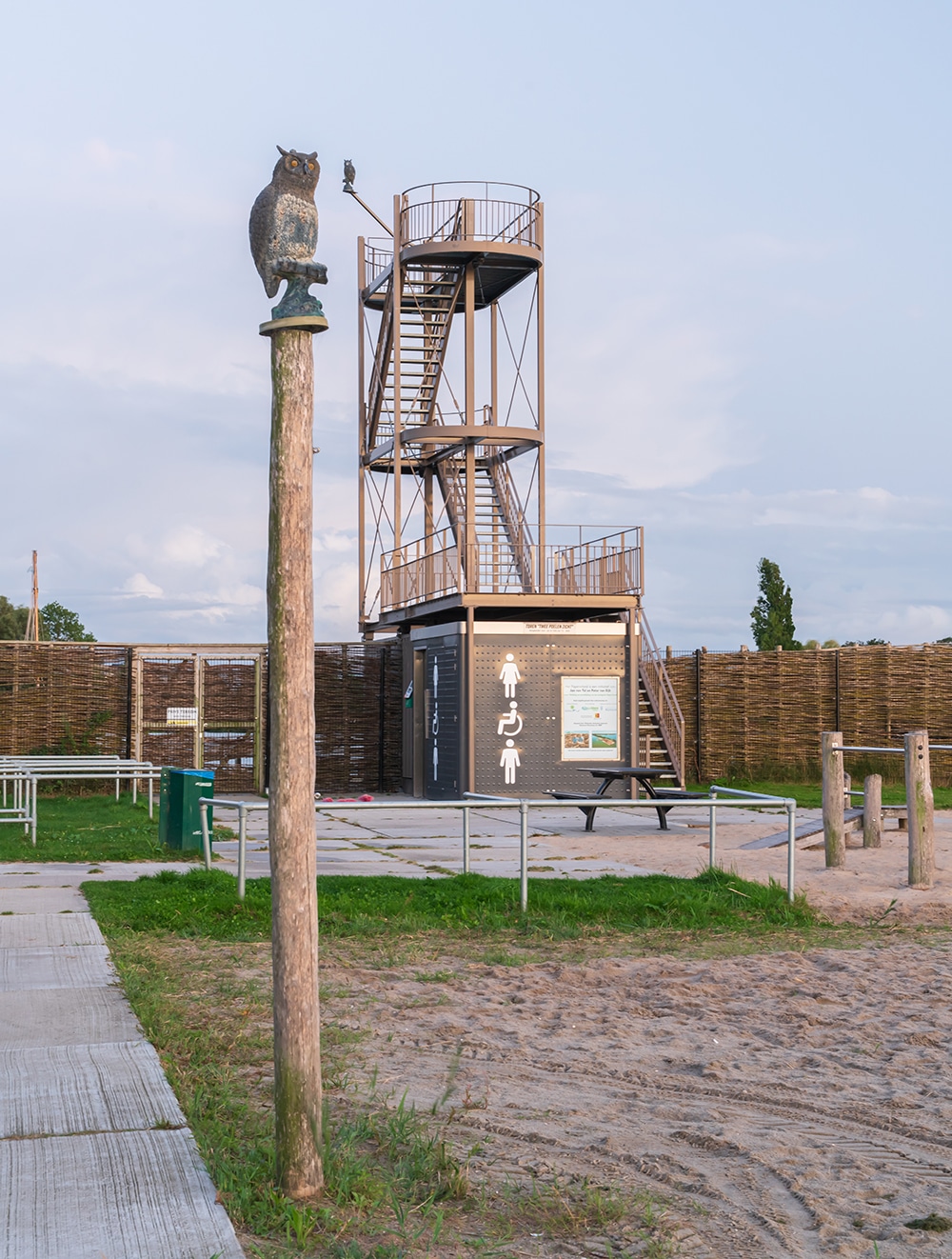 Uitkijktoren Papeneiland ligt, zoals de naam al doet vermoeden, op een eiland dat te bereiken is via een brug vanaf het Kerkpad. Wat direct opvalt, is dat het niet alleen een uitzichttoren is, maar het ook de functie van toilet heeft. Op de begane grond tref je namelijk, heel efficiรซnt, het openbaar toilet van het recreatie-eiland aan.