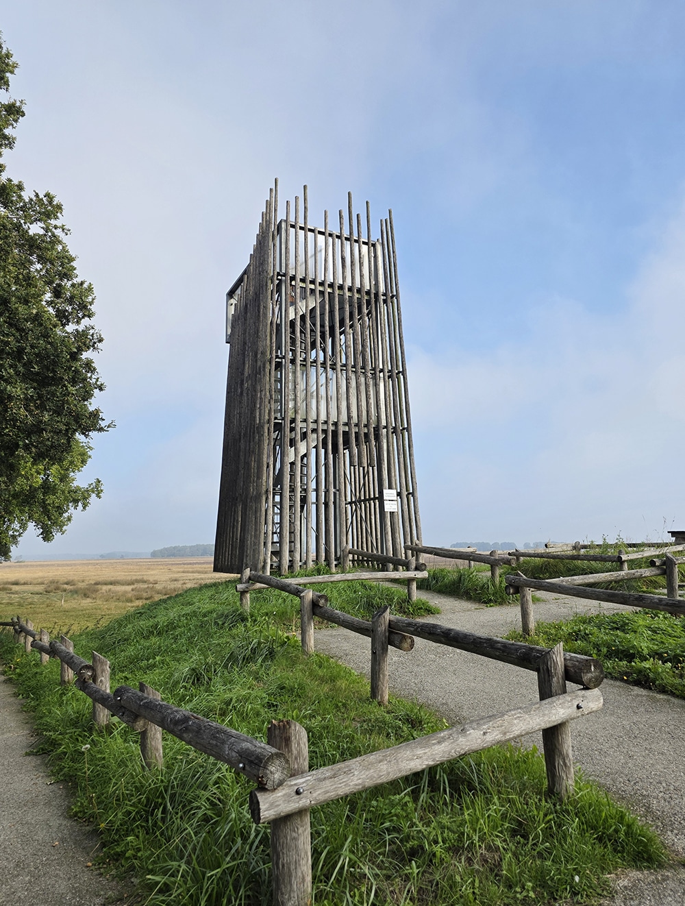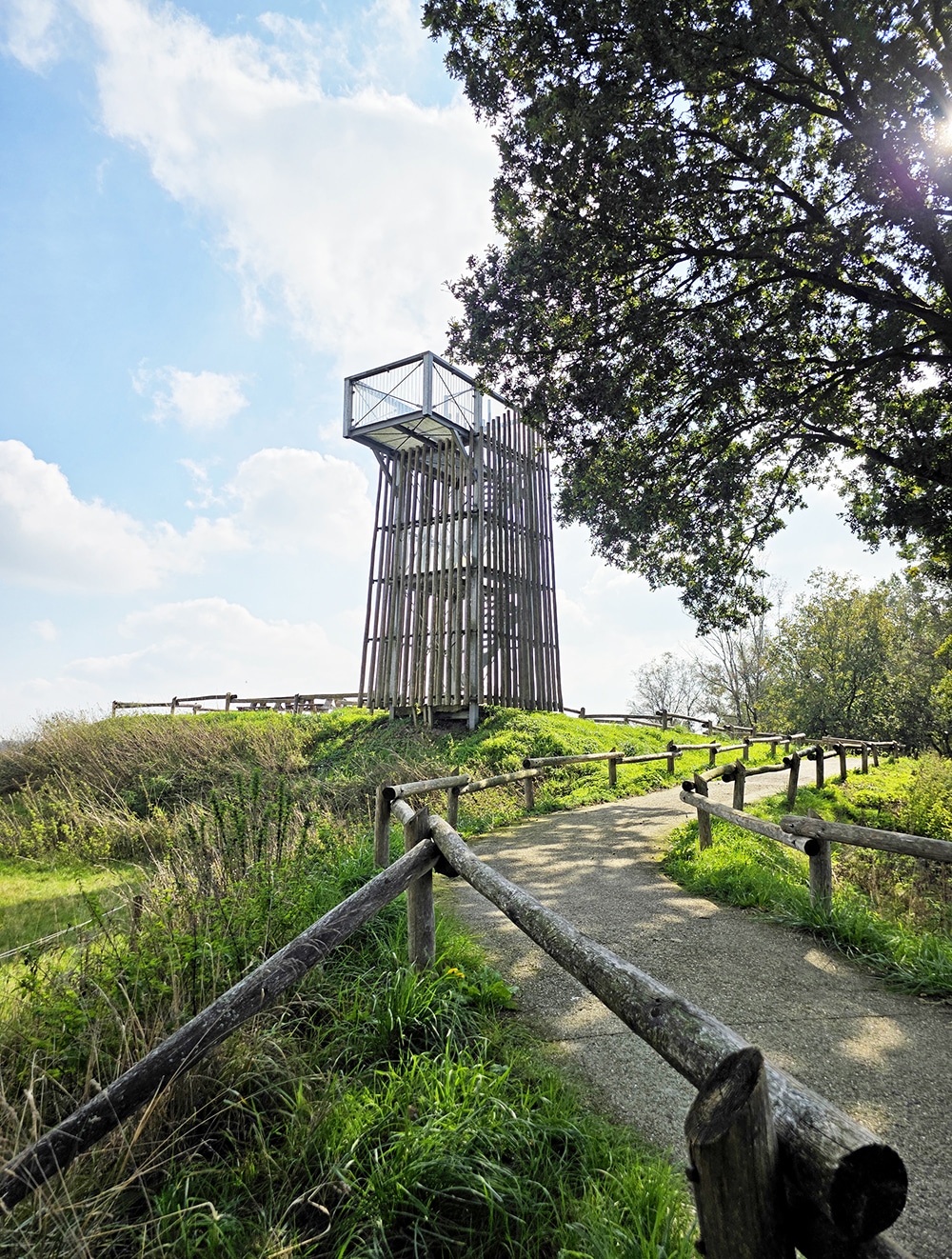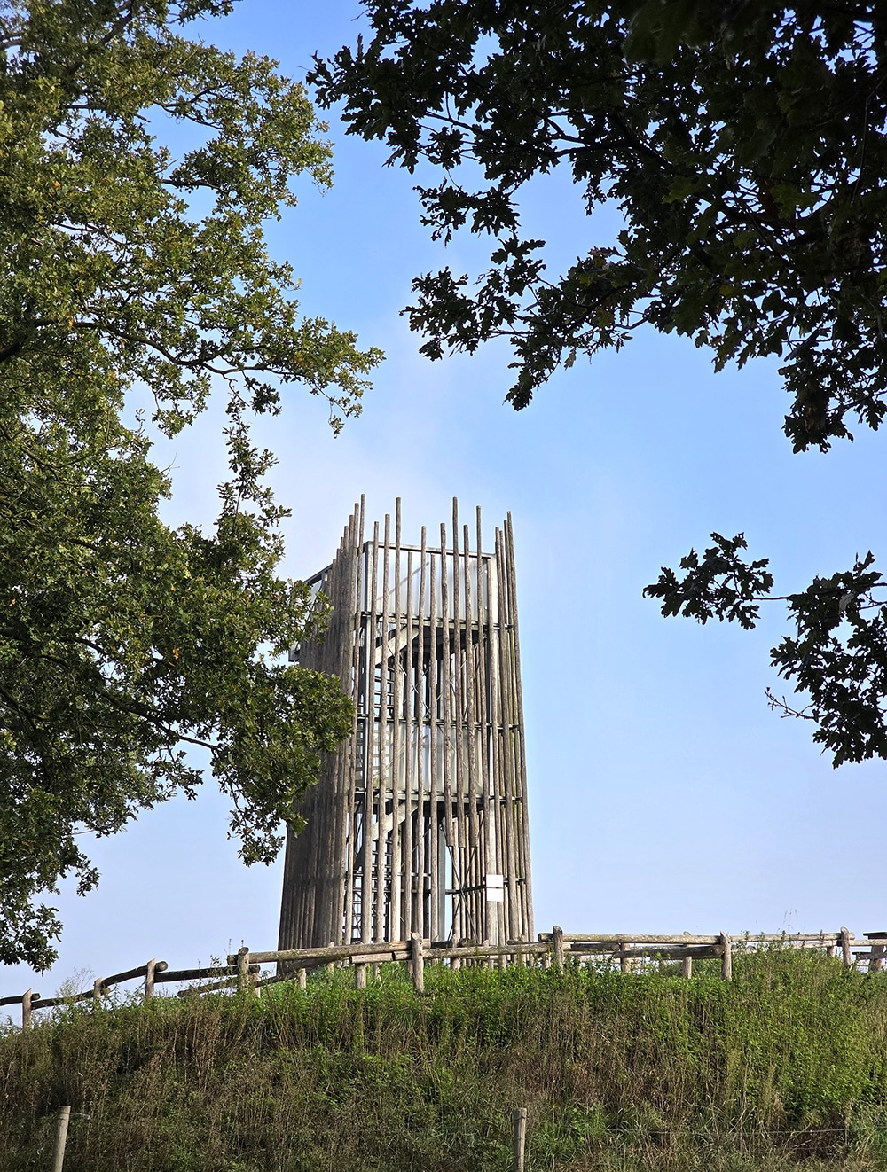 De uitkijktoren, met metalen constructie, heeft een vierkanten ontwerp en is omkleed met verticale houten palen die aan de bovenzijde in hoogte verschillen. Dit geeft de toren een speels karakter. Doordat de palen niet tegen elkaar staan, kun je dwars door de toren heen kijken en oogt die heel licht, waardoor het uitkijkpunt goed in de omgeving opgaat. Opvallend is ook het brede uitkijkplatform boven op de toren dat aan een zijde behoorlijk uitsteekt.